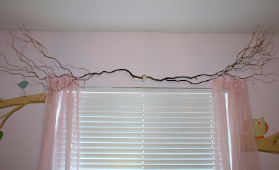 Some of you may remember my mantle/swag made of willow sticks that I gathered from my backyard. As I was dismantling the mantle I was sick at the thought of tossing all of the perfectly useful sticks and then the light bulb went off. I could use them as a curtain rod in the girlie's bedroom. The white rod I was currently using just seemed to get lost on the pink wall. It was the perfect fix...quick and cheap, just the way I like it.